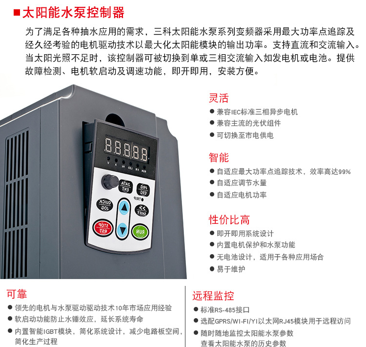 SK650系列變頻器是三科推出的針對光伏發(fā)電,驅(qū)動三相交流水泵的變頻器,它采用大功率點追蹤及久經(jīng)考驗的電機驅(qū)動技術(shù)以催化增大太陽能模塊的輸出功率,它將直流電直接逆變成三相交流電,可驅(qū)動各類交流水泵。同時它支持直流和交流輸入,當沒有太陽能時,該變頻器手動切換到單項或三相交流電輸入,如市電發(fā)電機或電池。SK650光伏水泵變頻器提供全方位保護,電機軟啟動及調(diào)速功能,即開即用,安裝方便。