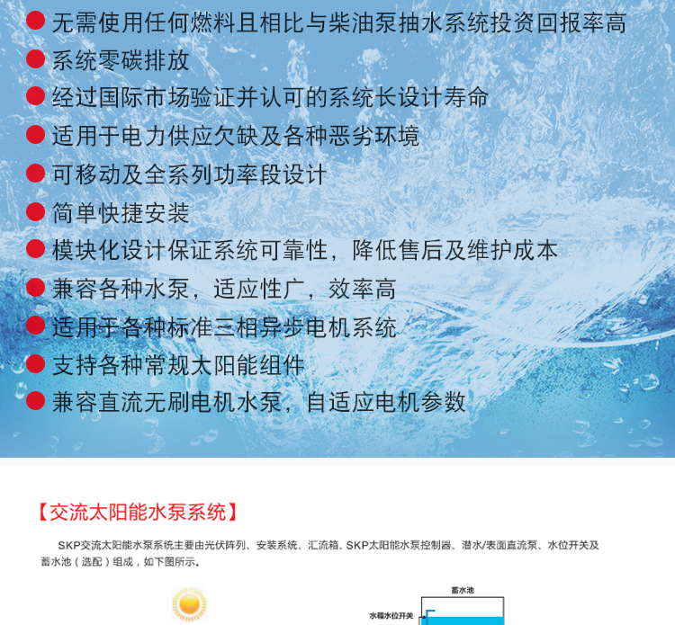 應(yīng)用行業(yè):廣泛應(yīng)用于陽(yáng)光充足、市電短缺的地區(qū),可以解決農(nóng)場(chǎng)灌溉、畜牧養(yǎng)殖、生產(chǎn)生活的用水問(wèn)題。