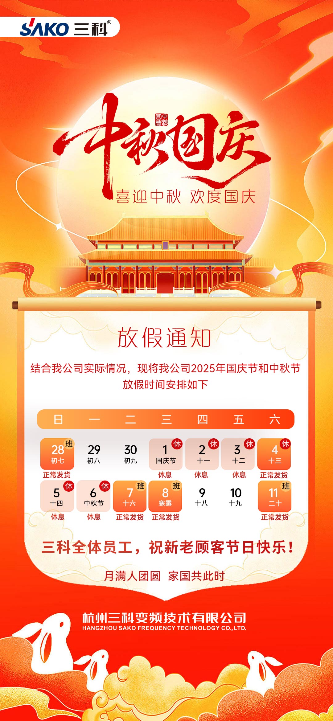 根據(jù)國家法定節(jié)假日安排,結合公司實際運營情況,杭州三科變頻技術有限公司2025年中秋、國慶節(jié)放假安排如下: