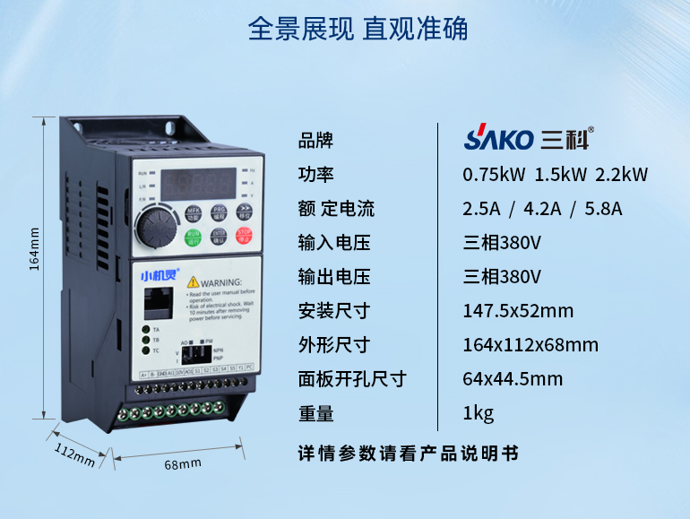 安裝需由電氣專業(yè)人員操作,接地電阻小于 0.1Ω,電機電纜超 50m 建議加裝輸出電抗器,說明書詳細標(biāo)注端子功能與尺寸(部分型號 68mm×164mm×112mm,凈重 0.75kg),方便部署。